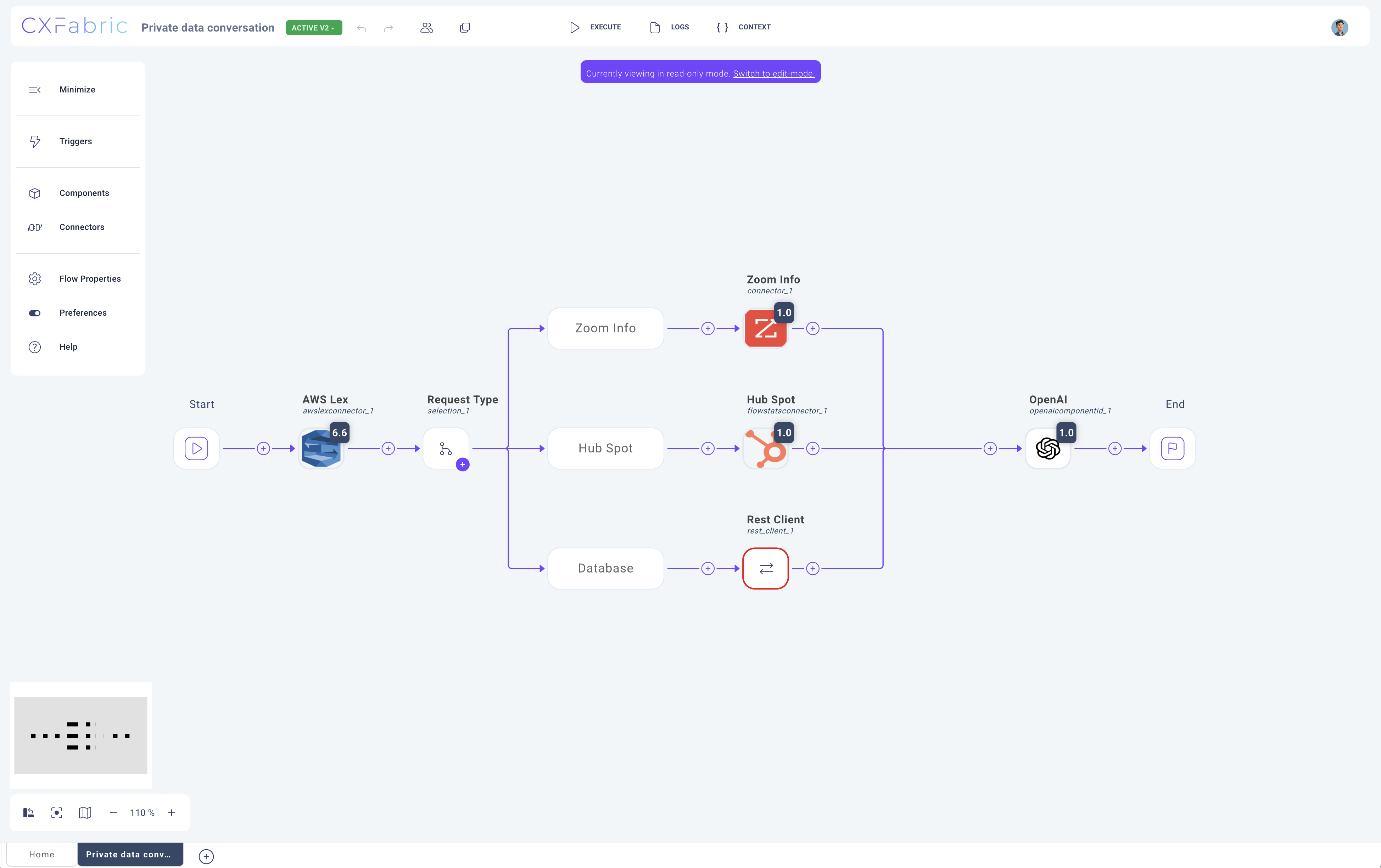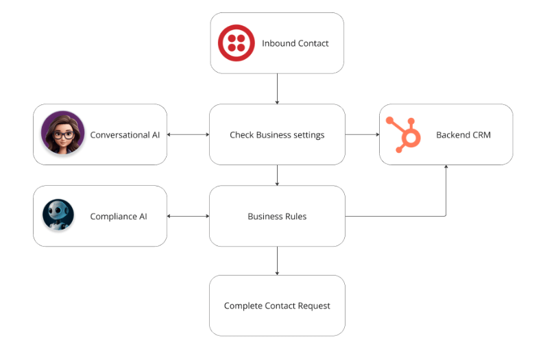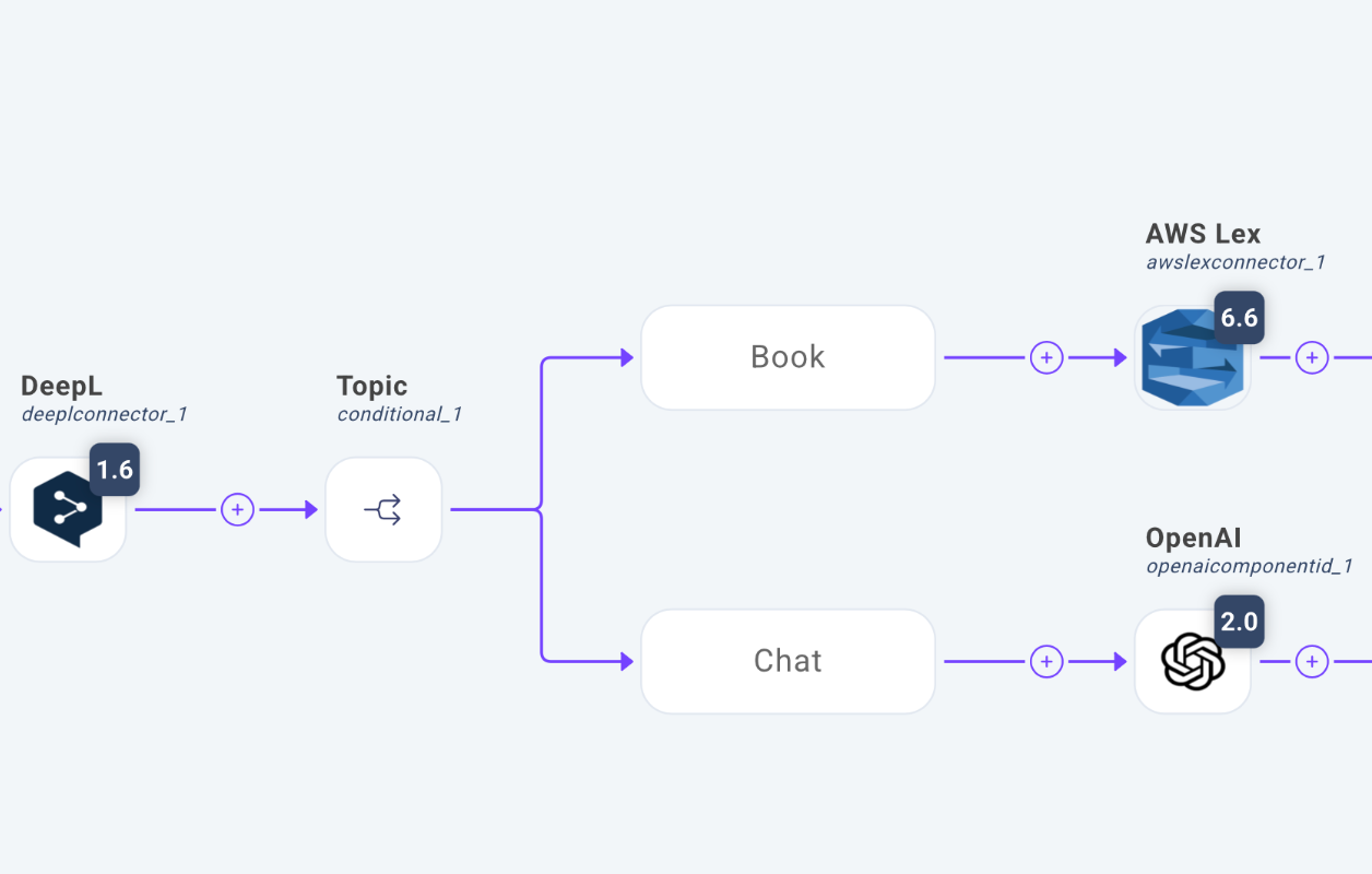 Integrate to multiple platforms such as different AI, CRM, CPaaS, and data sources. Take action based on AI events to move the process forward, ensuring guard rails and clean data.