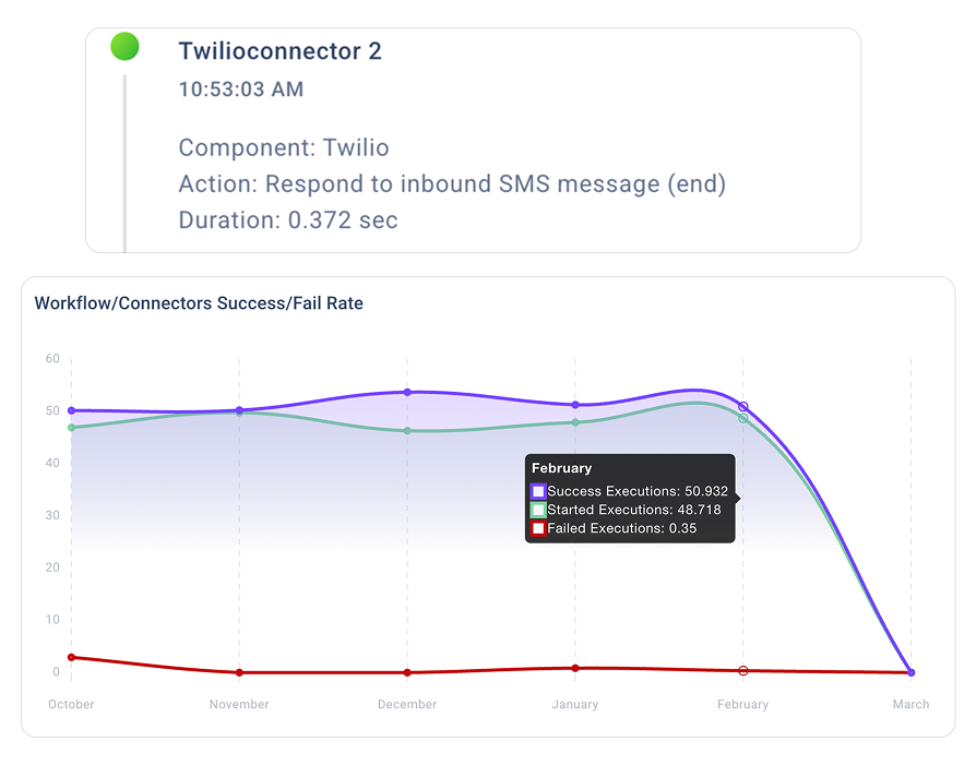 Monitor flow and connector usage by Tenant ID with built-in tracking. The platform records flow executions, their durations, and the time spent on each asset (connectors..), enabling precise consumption-based billing.
