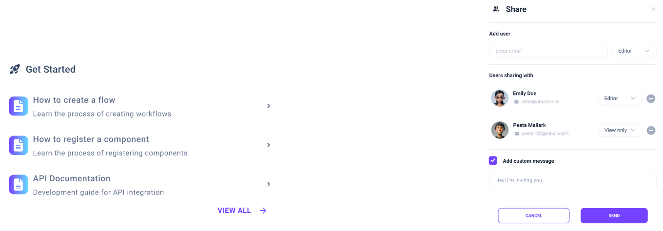 Securely share assets like flows, connectors, and credentials using built-in roles and permissions, or create custom access profiles. Control access levels with precision—grant read-only, edit, or full admin rights based on user needs.