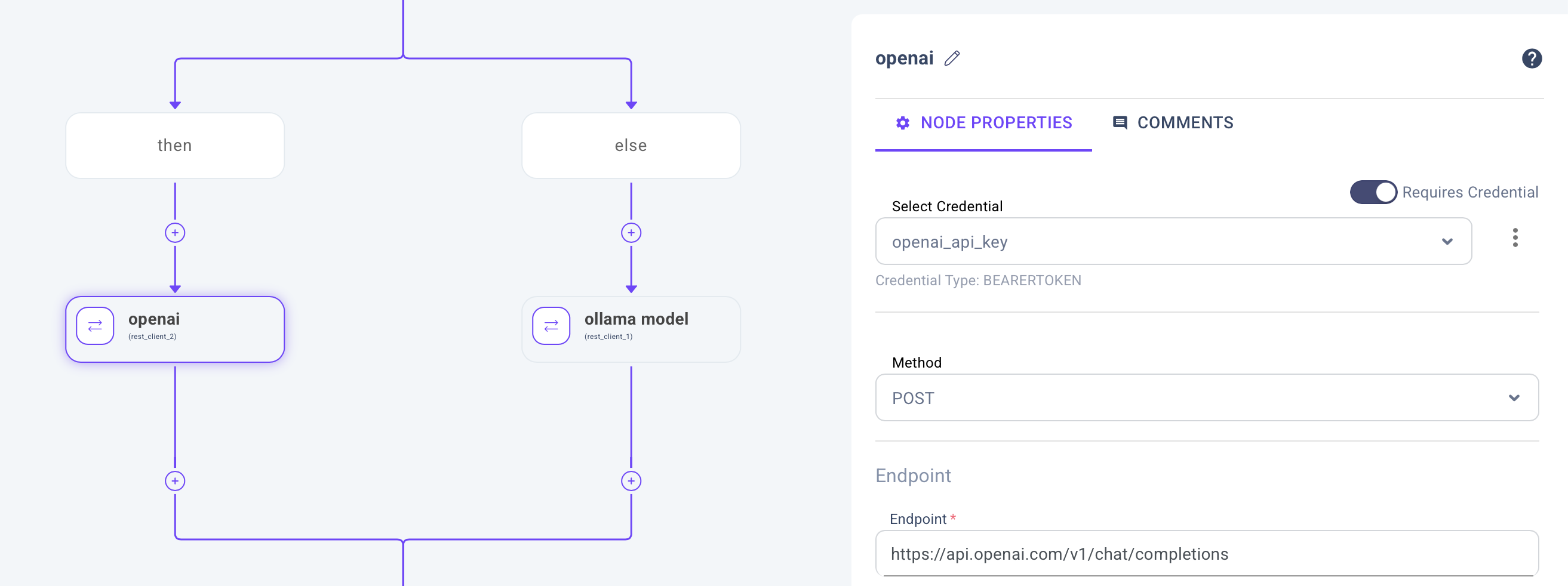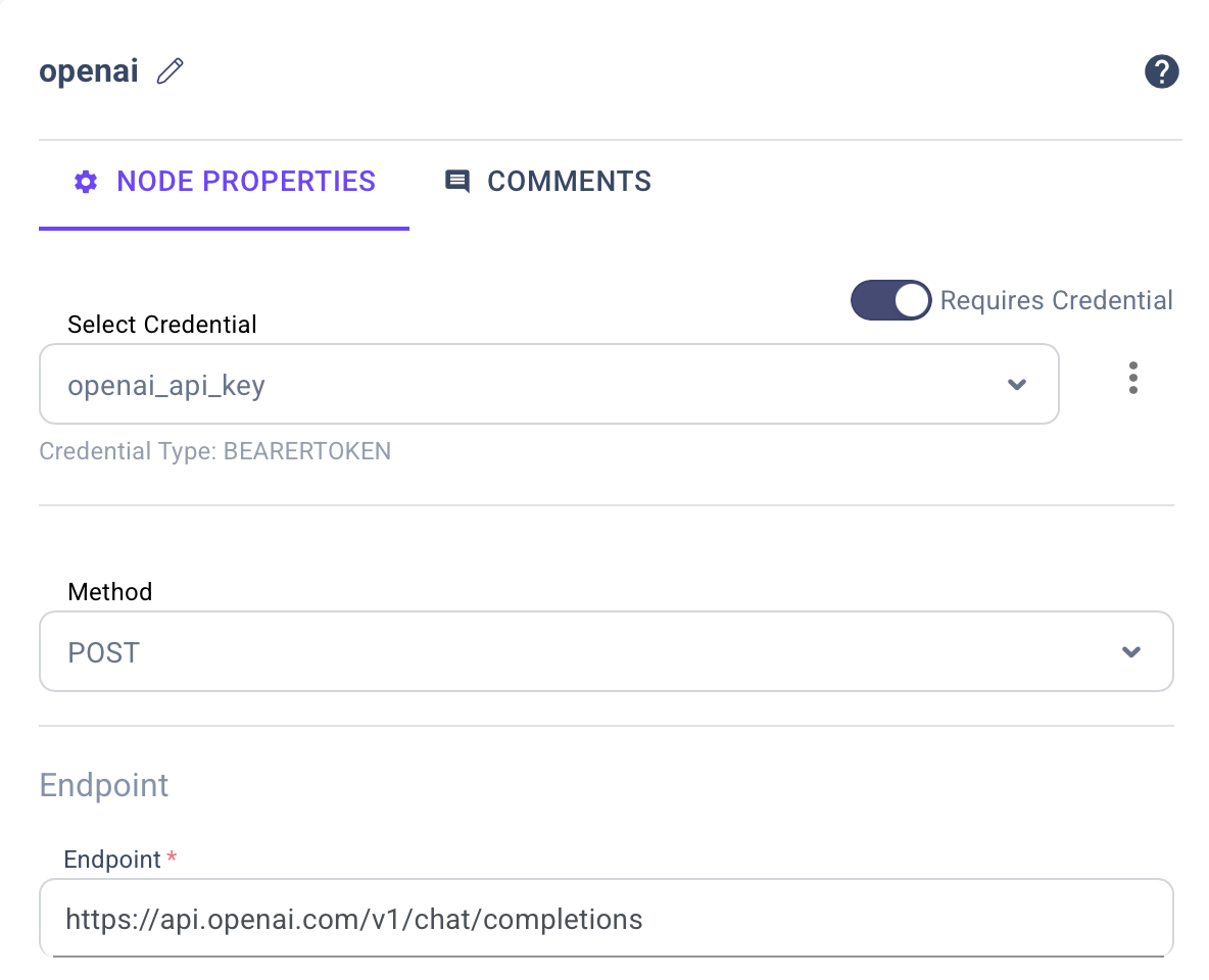 Set credentials directly in your flow by editing the properties of a component or connector. You can choose from credentials you created, ones shared with you, or those already included in a shared flow.