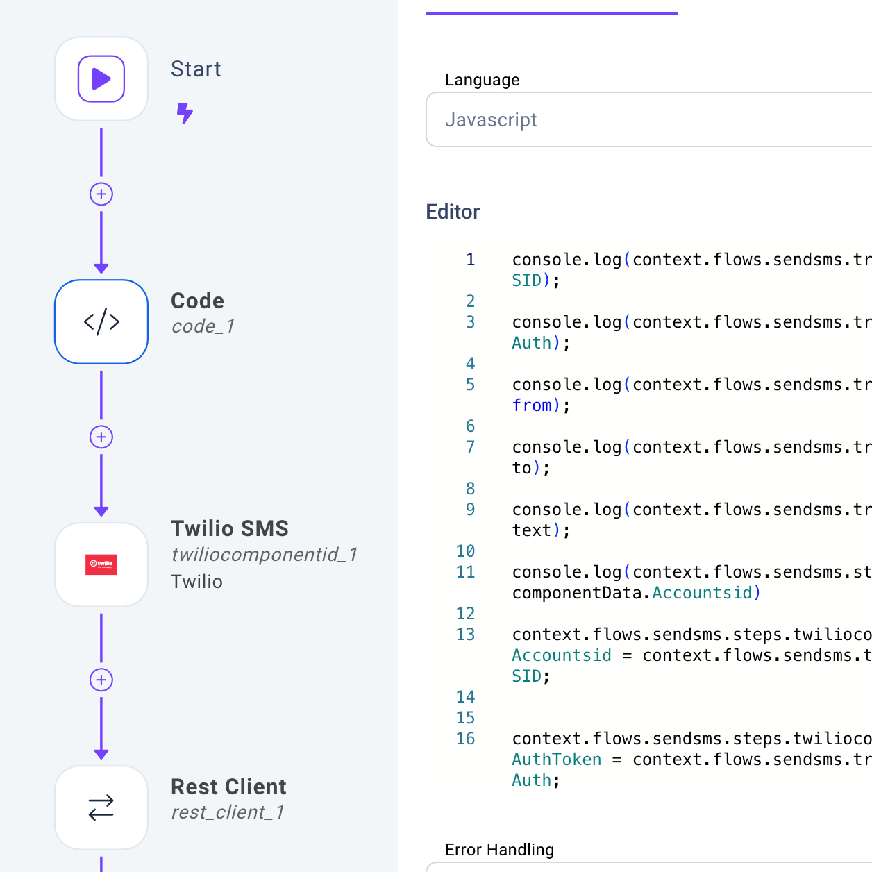Our low-code/no-code tools accelerate integrations by allowing users to create workflows visually, minimizing the need for extensive coding. For advanced needs, developers can seamlessly add custom code, directly into the flow by using the Code component, offering flexibility without slowing down the process.